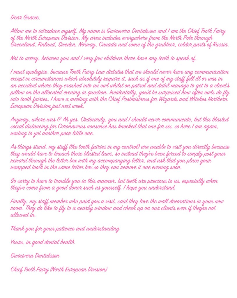 Anyway, the question was raised whether the tooth fairy would be allowed to visit during these Social Distancing times.